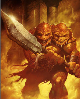 Bazim-Gorag the Fire-Bringer: He has two heads. He can take a human form of a guy with bronze skin, red eyes and he wields a glaive sheathed in black flame. He has an aura of flame, and he can make incinerating attacks.