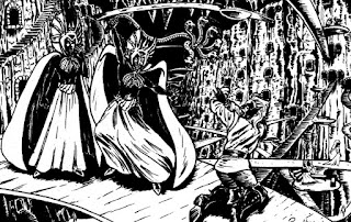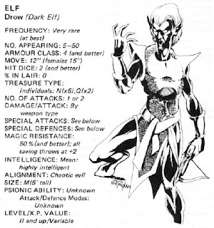 We get a massive drow entry in the back of the module. The drow were "bitter and cruel" elves driven out by their kin, and they constructed a "gloomy fairyland" underground and now quite enjoy it. They still resent the elves for what they did.