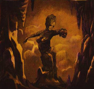 Earth Demon: "These chunks of demonic earth are simpletons even by the standards of the elemental demons." They can assume the form of a featureless rock or as a human-shaped statue of a demonic horned warrior. Its face is permanently etched into a leering grin.