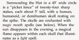 - It is surrounded by a fence topped with 24 talking skulls that can shoot fireballs if the PCs jump the fence rather than using the gate.