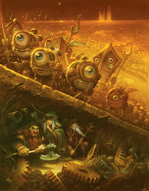 We kick this one off with a great full page depiction of adventurers hiding from a horde of marching modrons. I love all of the references to books and D&D lore.