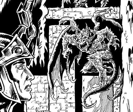 Zaggutch: This pit fiend first shows up in a very cool encounter. The heroes look into a mirror. Zaggutch appears inside the mirror, and begins doing terrible things to the adventurer's reflections! He kills them and eats them. Here's some of the flavor text: